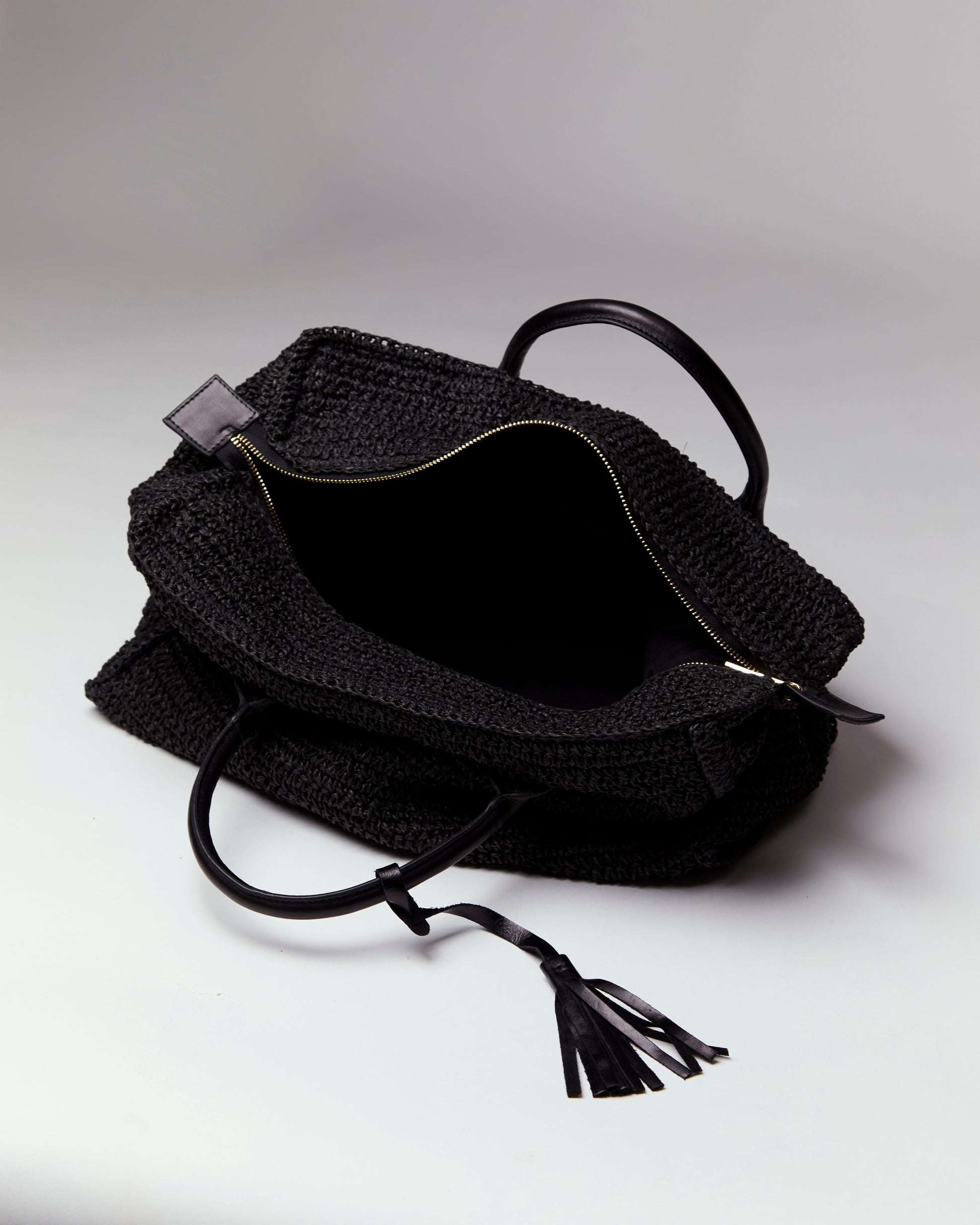A rectangle shaped hand carry bag, Crocheted by hand, made with a double raffia yarn and black calfskin leather.